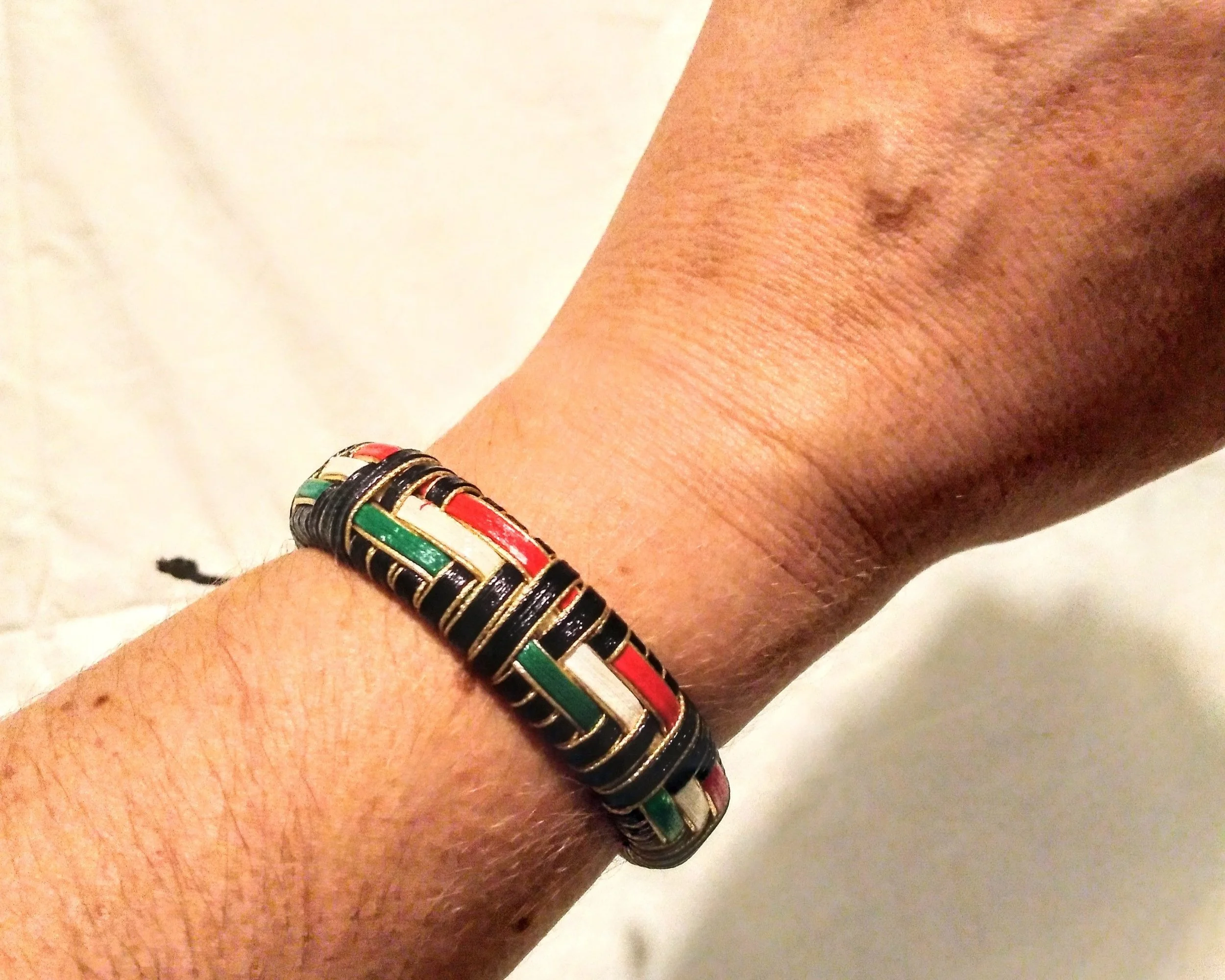 Woven bracelet in black, green, white, and red.